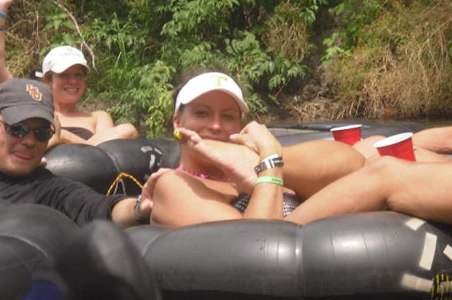 Saturday, however, was when we all went tubing on the river, and since this is a Steppin out SATURDAY post, I'll keep it to one day. Apparently, the Guadalupe River is famous for its river tubing. There were so many people in town doing this exact same thing. There were about 15 of us in our group, and you go and rent your tube (with a bottom for the coolers of beer, natch) and you all tie together and float the river anywhere from 3-6 hours.